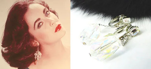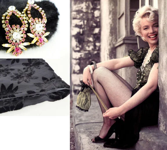Classic feminine touches. Cut black silk velvet scarf and crystal rhinestone chandelier earrings in vanilla & pink.