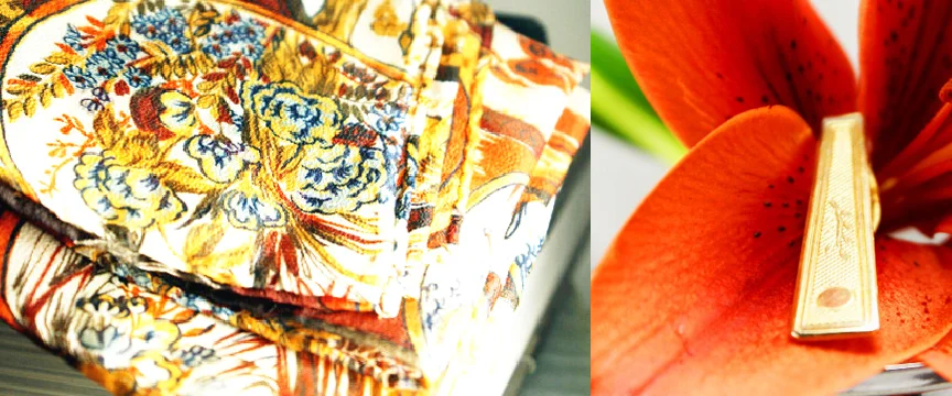 Mod vintage Vera silk scarf packaged in a fun flower heart shaped tin with Opal magnetic scarf brooch Mag TAK "Chick Magnet"