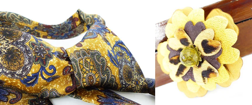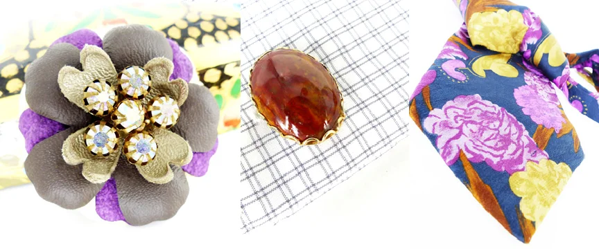 From our Woman's Renaissance Etsy store: Magnetic leather flower lapel pin that can be worn on jackets, shirts, hats and as a choker necklace embellishment. Cufflinks for women & a great feminine vintage silk tie.