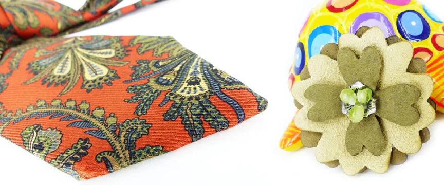 Rich rust floral paisley silk vintage tie paired up with a layered leather sage green MagTAK, magnetic flower.