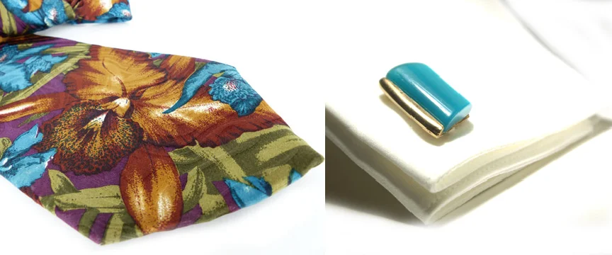 OWN THE OFFICE: Brilliant Pop Art silk tie with a pair of Czech floral glass and pearl cufflinks.