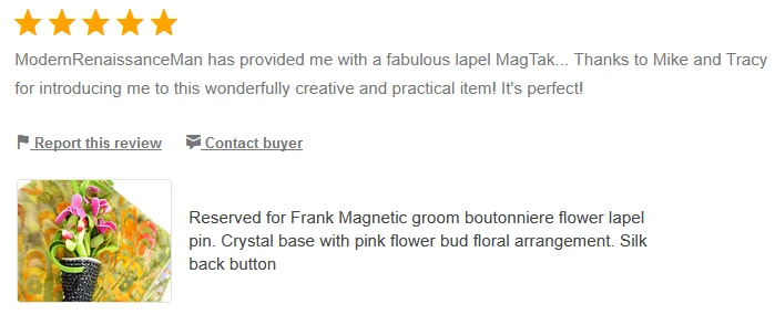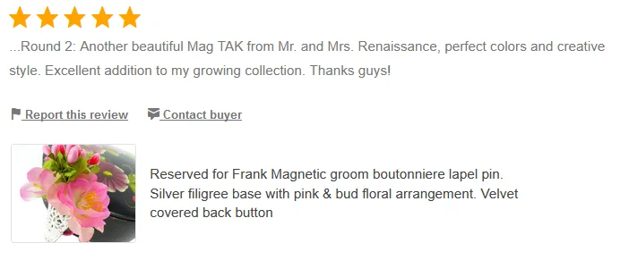 It was a pleasure dealing with Tracy - she really did go the extra mile to accommodate my requirements. The lapel pin is great. The magnets are very strong - no risk of it falling off. The vintage container it arrived in is wonderful too. Highly recommended and will happily purchase from Tracy again in future.